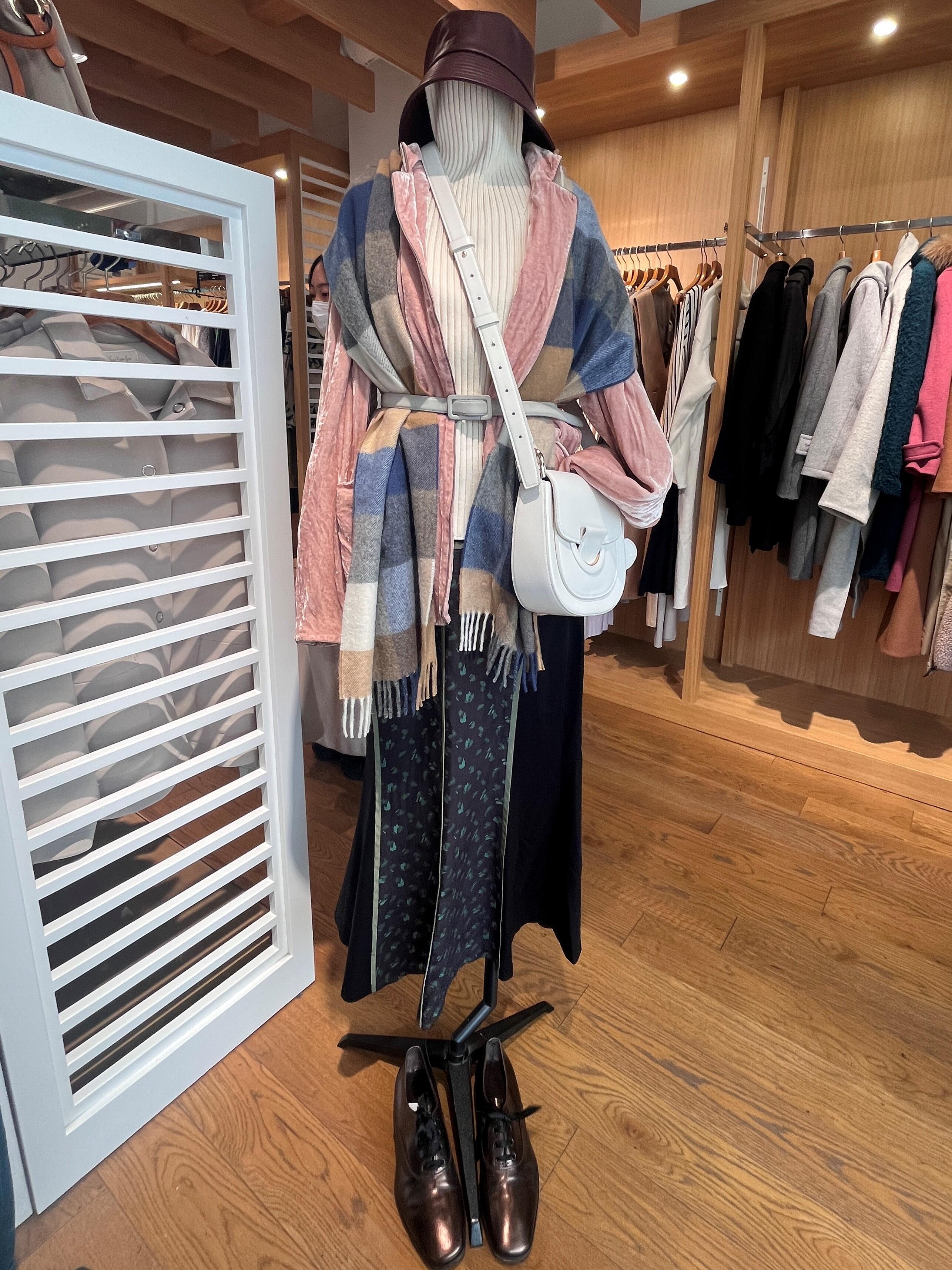 ジャケット、ストールを巻き込んだこちらのコーデには普段のサイズより大きめになるので、穴のないタイプのベルトがおすすめです。