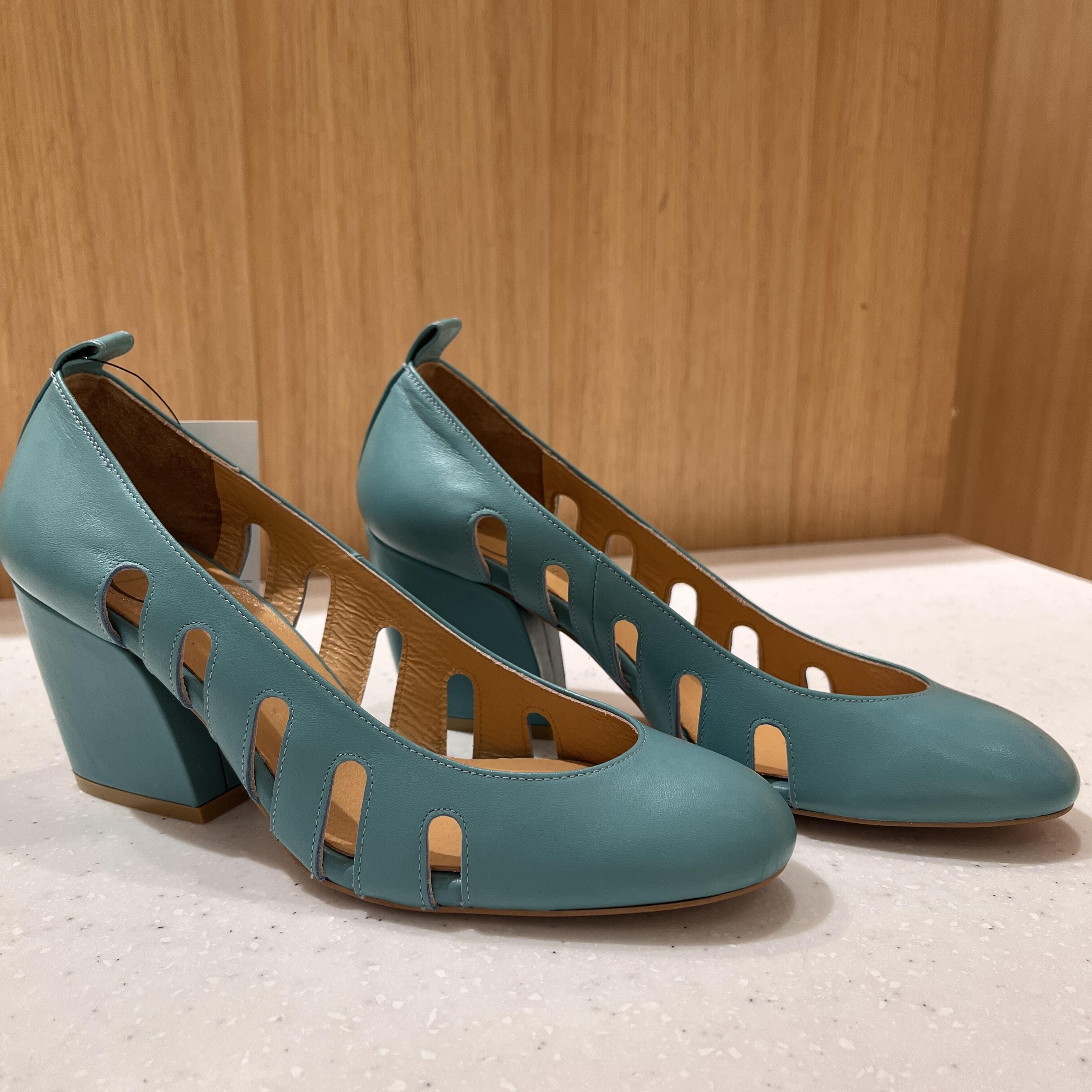 ①シルバーの明るさとコロンとヒールにときめく一足