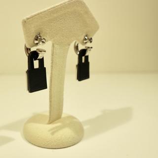 カデナ(南京錠)モチーフの背面に同じ形のレザーが付いたピアスです。