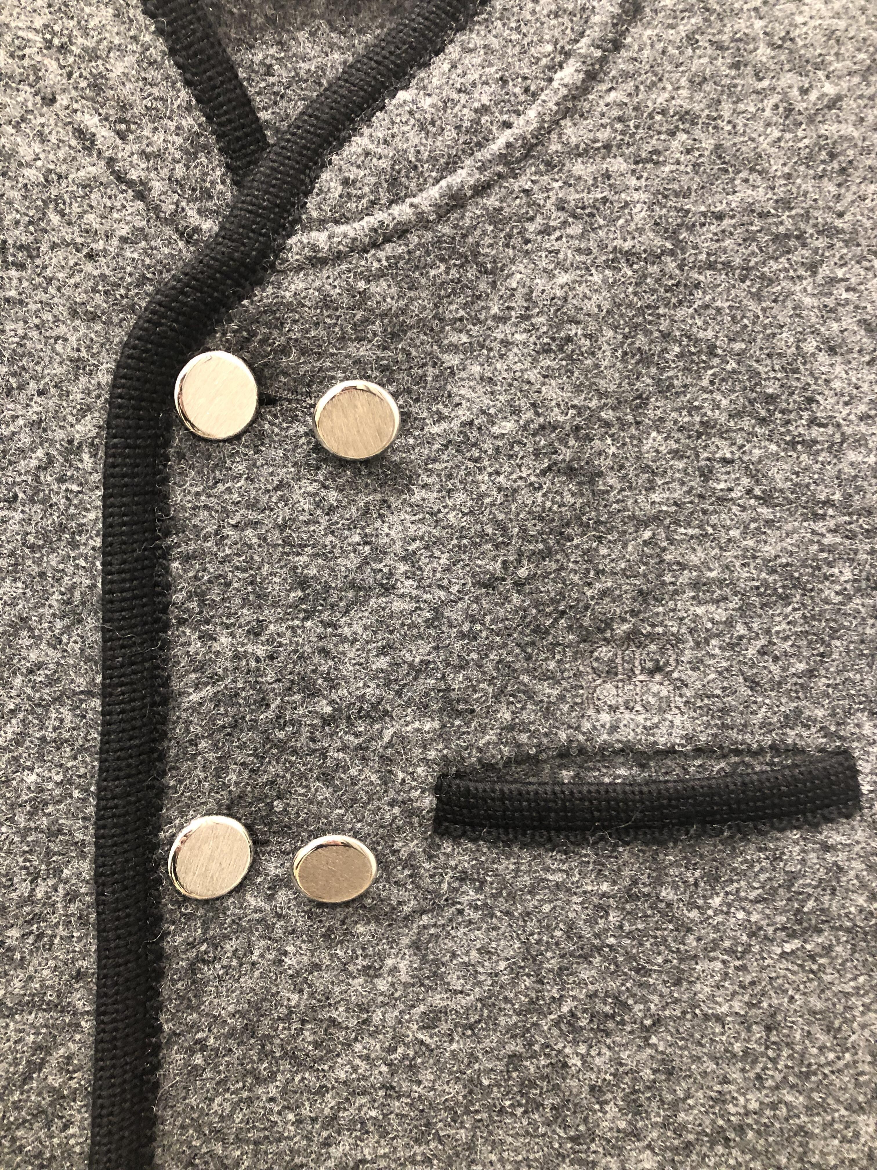 タイトな身幅感や、大ぶりなシルバーのボタン、重厚なパイピングなど、細部のディテールが民族衣装をモードなアイテムへと昇華させています。