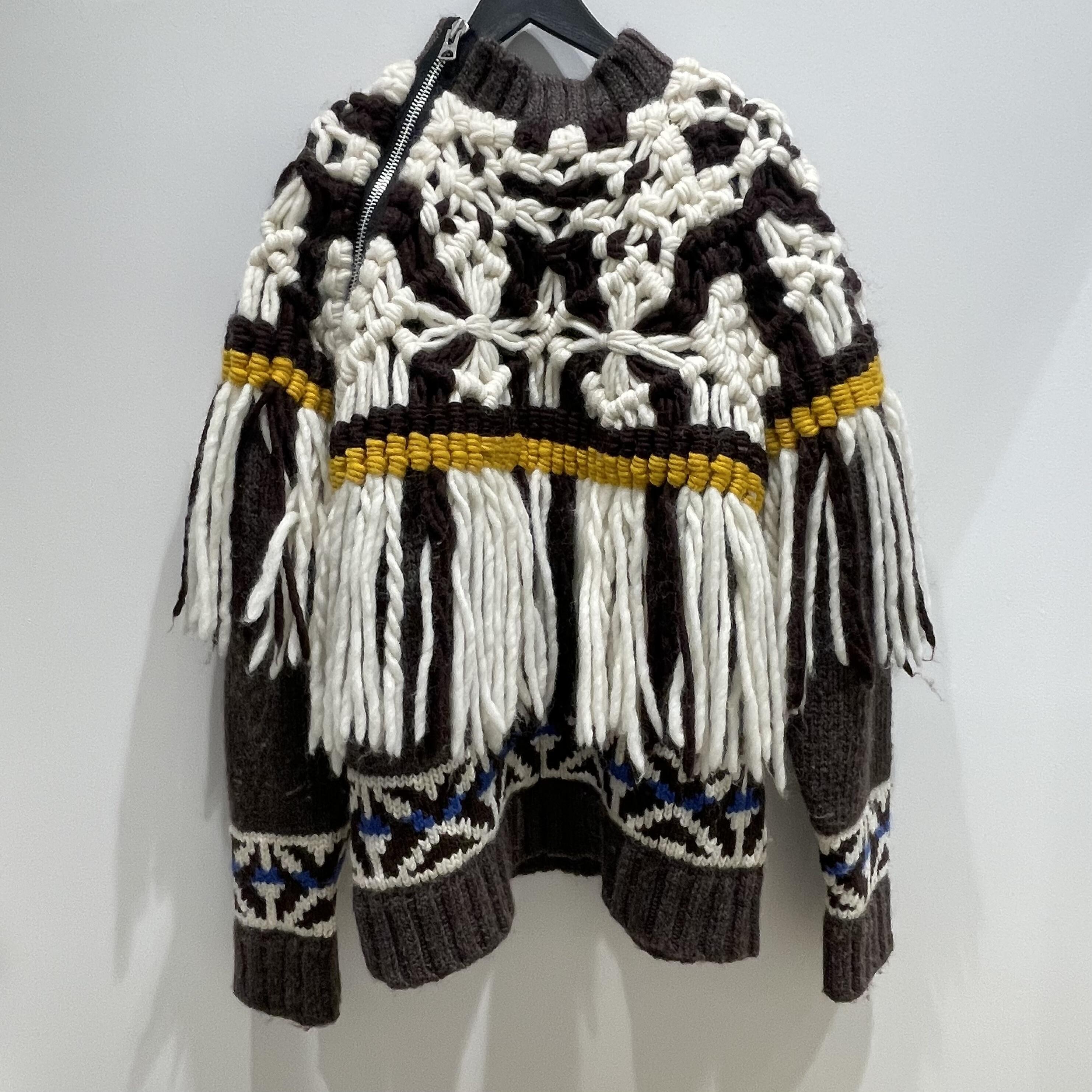 極太ウール糸をマクラメ状に編み上げ、肩から胸元にかけて大胆にフリンジをあしらったプルオーバー。