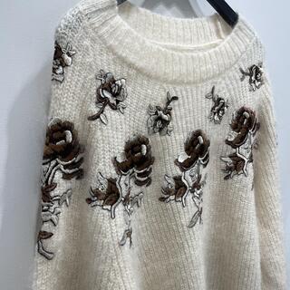 ホワイトのモヘア混ボディにブラウン×ベージュのフラワー刺繍を贅沢に施したニット。