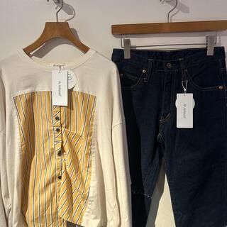 1点目がこちらの、ホワイトボディにイエローのストライプ生地をドッキングしたトップス。