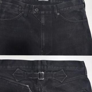 次に背面、サイドから裾に伸びるカッティング、腰部分についたアジャスター、バックポケットジップに使用されている金具はどちらも風合いの感じることのできる金具。