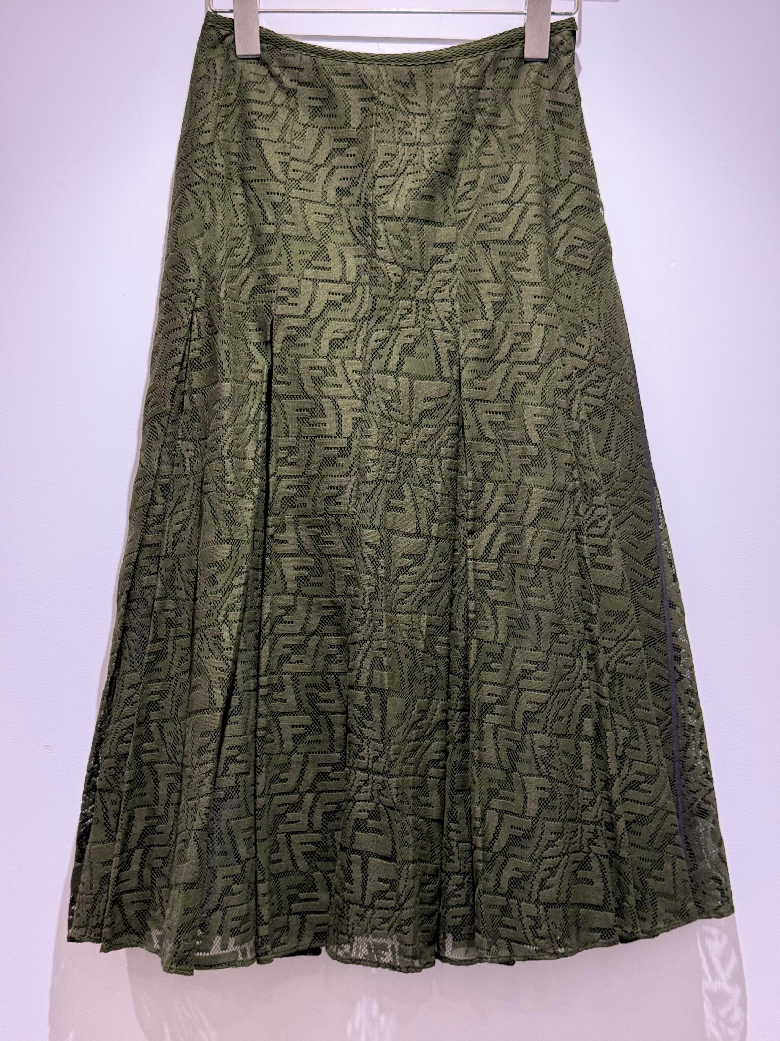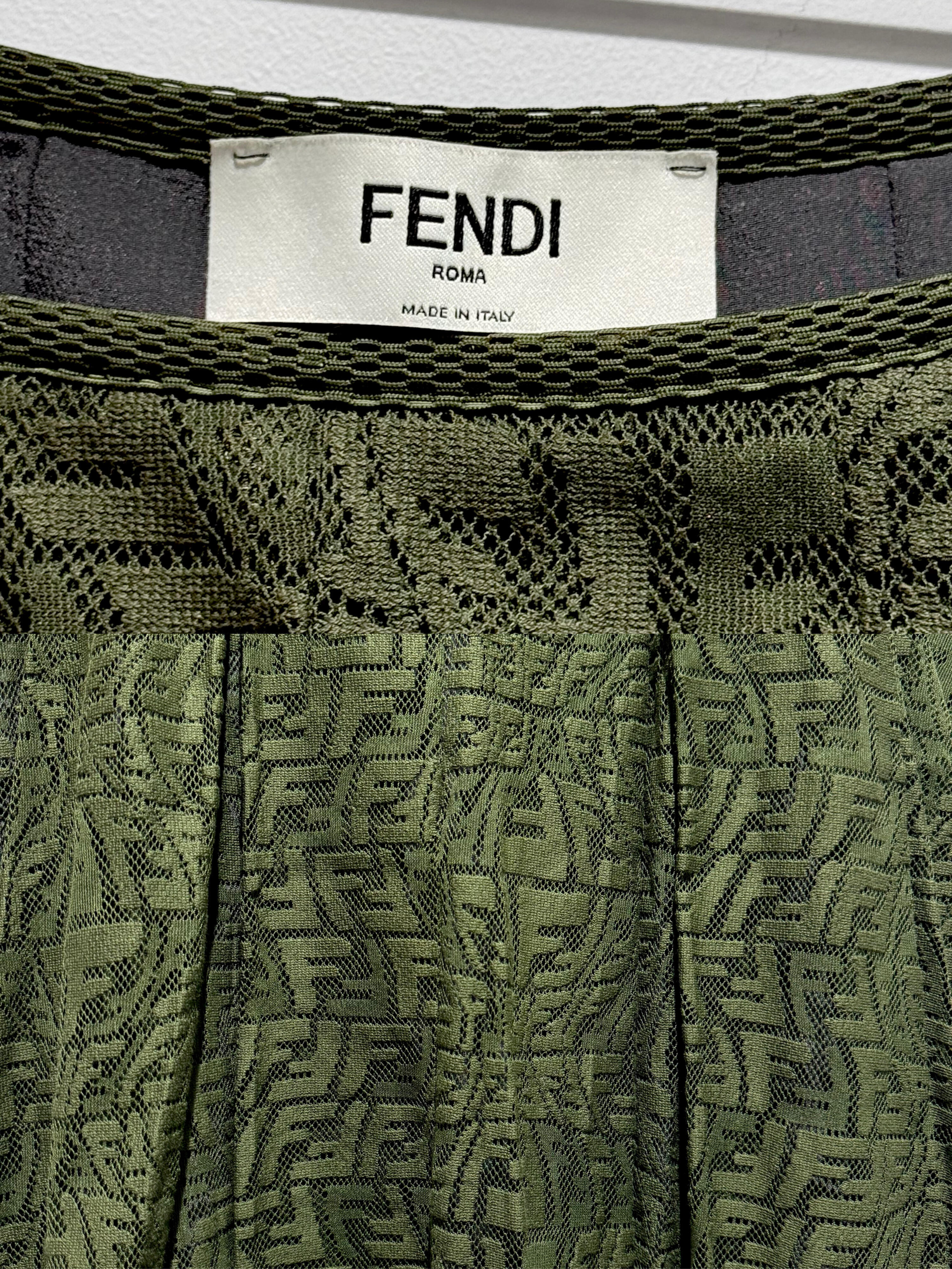 そんなオリーブグリーンのアイテムのなかでもその特徴が最大限に活用されているアイテムが、こちらのFENDIのスカートです。ややフレアに広がったつくりで格子状のメッシュに編まれたジャガード地は、波打つかのようにデザインされ、プリーツ加工によって適度なボリュームと軽さがあります。素晴らしいデザインですね。![]()