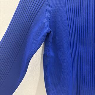 鮮やかなブルーが印象的な1着。ポリエステル素材ならではの軽やかさと、ミドルゲージの程よい厚みが特徴で、春夏シーズンの羽織りとして大活躍してくれるアイテムです。