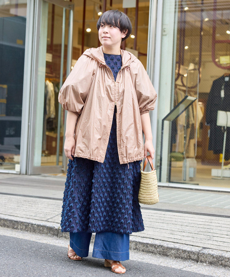 表情豊かなネイビーワンピースに、軽やかなナイロンブルゾンを羽織り、ぐっとカジュアルダウンした着こなし。ゆったりとしたシルエット同士を重ねることで、リラックス感のあるバランスに仕上げています。ナチュラルな小物を取り入れることで、肩の力が抜けたカジュアルスタイルを完成させています。