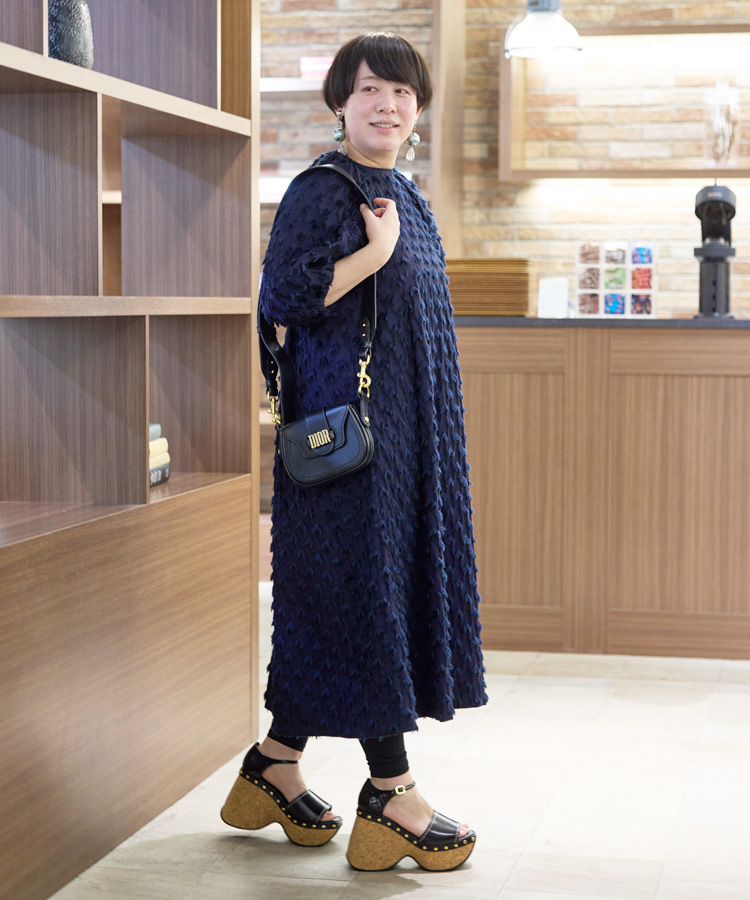 立体感のある素材が印象的なワンピースを主役に、落ち着いたネイビーカラーでまとめた大人のきれいめスタイル。足元にはボリュームのあるサンダルを合わせ、程よく抜け感をプラス。コンパクトなショルダーバッグで全体を引き締め、上品さと日常使いしやすいバランスを両立したコーディネートです。