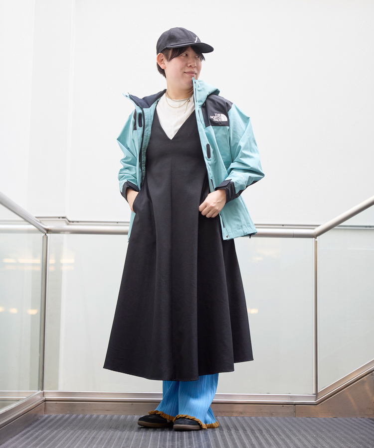 マウンテンジャケットを羽織ることで、軽やかでアクティブな雰囲気に仕上げたオフスタイル。インナーは白トップスでクリーンにまとめつつ、プリーツパンツで動きと奥行きをプラスしています。キャミワンピースの落ち着いた印象に、淡いブルーのアウターがやわらかなアクセントを添え、全体を軽やかに。スニーカーとキャップで程よくカジュアルダウンし、抜け感のあるバランスに整えたスタイリングです。
