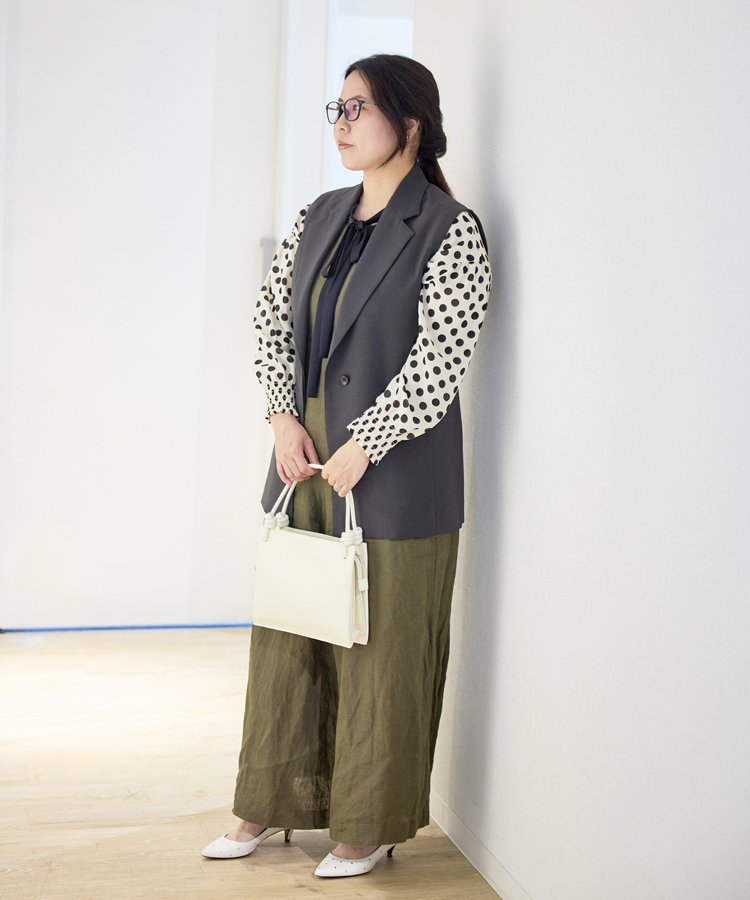 ナチュラルなリネンオールインワンに、相反するテイストのドット柄ブラウスとカッチリとしたジレをミックス。素材と柄のコントラストを効かせた遊び心のあるスタイリングです。ホワイトのバッグとパンプスが全体のトーンを明るく整え、凛とした女性らしさが際立つスタイリングです。