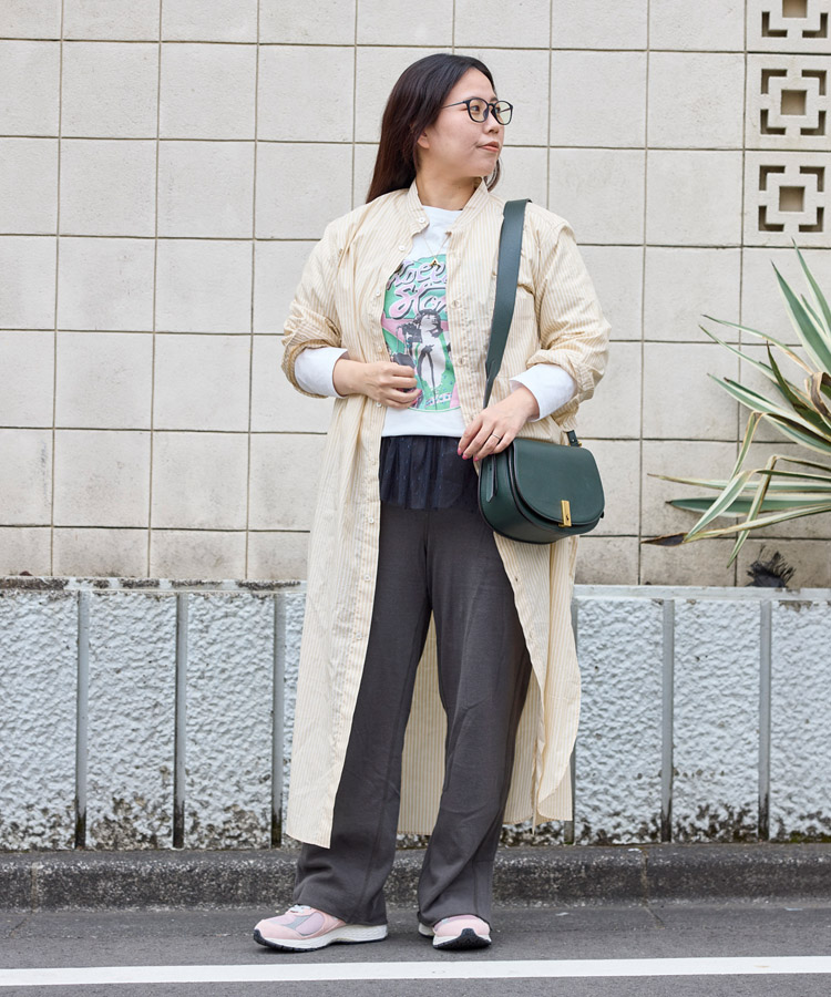 シャツワンピースは、ボタンを閉じれば端正でクリーンな印象に、開けて羽織れば軽やかで抜け感のあるスタイルへと変化する一着。今回はフロントを開け、ロゴTとパンツを合わせたラフな着こなしに仕上げています。縦のラインを強調しつつ、シーンに応じて雰囲気を変えられるのも魅力です。